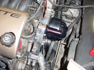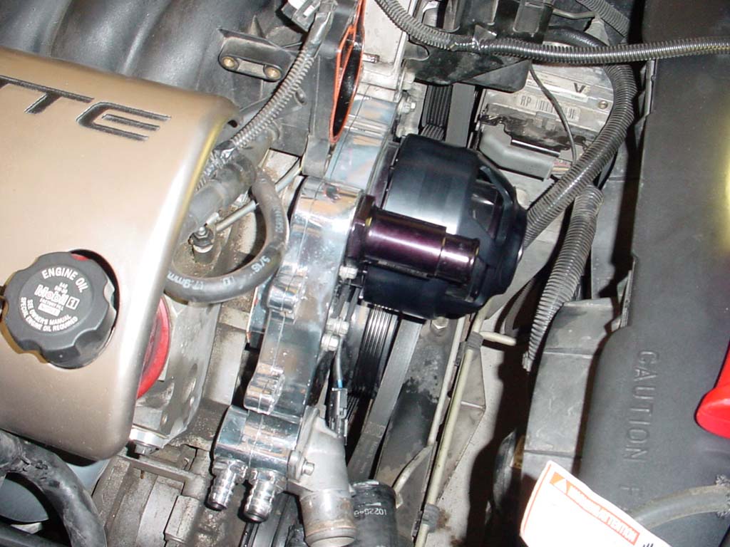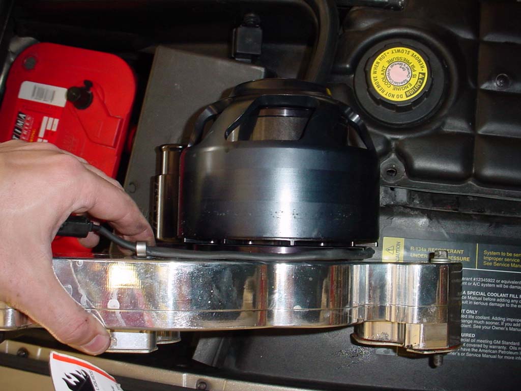 clamps. Now install the stock belt tensioner to the water pump using the stock 15mm bolts and torque these to 37lb/ft. Once the tensioner is installed, re-install the drive belt using the routing diagram in the engine bay. I suggest you put the belt on all pulleys except for the water pump pulley, then put the wrench on the tensioner and reduce tension, then slide the remaining part of the belt onto the waterpump. |