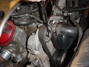Using a 15mm wrench on the center bolt through the tensioner pulley, push the tensioner towards the drivers side of the engine to remove tension from the main drive belt. With tension removed, slide the belt off the main water pump pulley (or any other pulley) and then release the tensioner and remove the belt from the vehicle. |