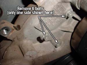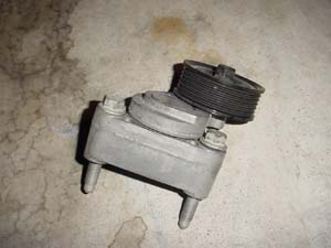 way for now. With the two main hoses out of the way, you should be able to get your pliers in and compress the clamps on the final 2 smaller hoses (they are for the car's heater core) and then pull both of those hoses off. These too will spill lots of coolant onto the ground. Now that all 4 hoses are disconnected, get a 15mm socket and 3" extension and unbolt the 2 15mm bolts holding the tensioner to the water pump. |
