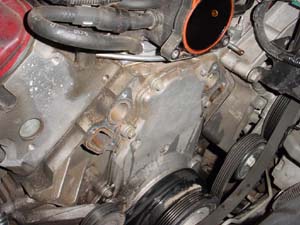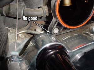 Once the pump has been worked in as close as you can get it, you may have found that it just simply wouldn't mate up to the block. This may be because the throttle body flange on your intake manifold is interfering with the pump itself, or it could be because the pump is interfering with the power steering bracket on the drivers side head. |