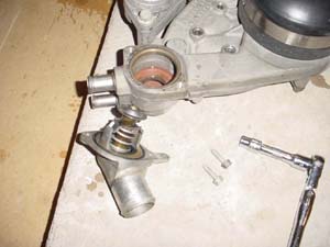 thermostat goes. Now place the thermostat into the opening with the spring on the thermostat going down into the pump. Reinstall the outlet spout and tighten as tight as you can get with your hand. |
