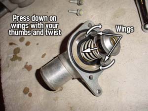 You can now see that inside the inlet is where the stock thermostat resides. We do not have any use for this stock thermostat in the meziere pump, and it must be removed. To remove the thermostat, you will need to press down with a lot of force on the 2 arms that come off the thermostat and slot into the 2 posts sticking up from the inlet. Once you are pressing down, you then need to rotate the whole thermostat until the 2 arms are out of the slots in the posts. It is hard to explain in words, so the picture on the left may help. |