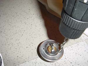 once we fill the radiator with coolant later. Start out using a 1/16" drill and drill into the thermostat away from the 2 support arms on the thermostat. Once you've got the two small holes drilled, go back in with a 3/16" drill bit and enlarge the two holes. Use a screwdriver or sand paper to break off any metal splinters that you may have created during the drilling. |