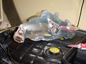 stock outlet spout from the stock water pump. It is held on by 2 10mm bolts. Once removed, pull the whole inlet spout up and out of the stock waterpump. |