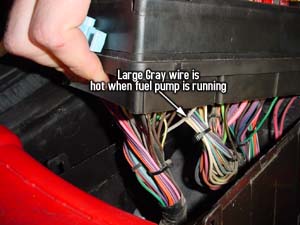 just leave a few feet attached for now. I now recommend you test this trigger wire using a volt meter or a 12v LED. Turn the key on and the volt meter should read 12-13V for 1-3 seconds and then shut off at the same time the fuel pump shuts off (you can hear the fuel pump). Assuming all is well, you can proceed! Run the newly added trigger wire down through the base of the fuse box and out the back side of it and pull it through. Once you pull the wire through the bottom, you can then reattach the top of the fuse box and re-attach the lid and thumbscrew. We're done inside there!
