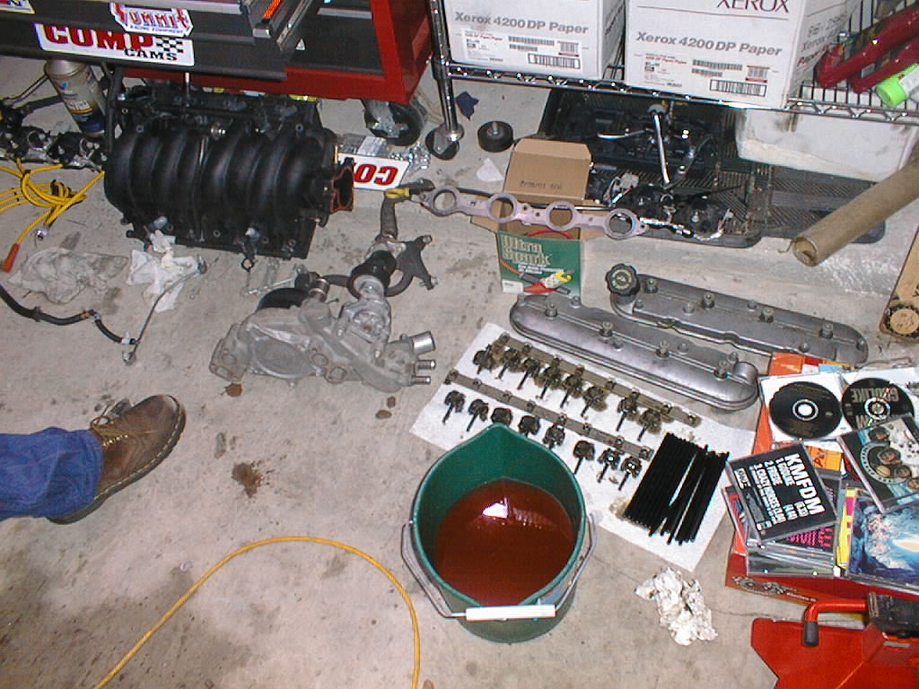 Now, if you want to do a cam swap, this is the time. Unbolt the plastic pushrod guides from the block and the lifter should come out with them. Set them aside keeping them in the exact same order you pulled them out. Pull the crank pulley, unbolt the timing chain cover, unbolt the cam gear, unbolt the cam retainer plate, then pull out the cam and slide the new one in. For more details on a camswap you can read MBasketts site here: www.torquecentral.com Note that you wont have to follow his instructions exactly since the heads will already have the springs installed and there is NO danger of lifters falling since the heads are off. A cam swap would literally take less than an hour at this point :) Now back to the headswap..... |