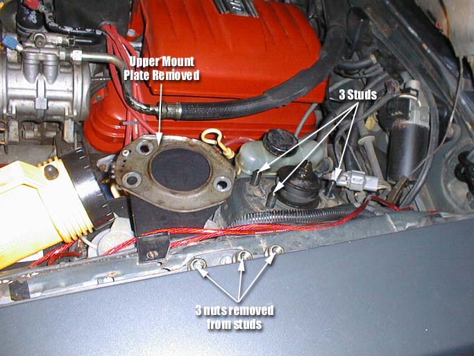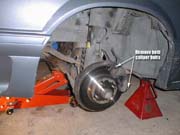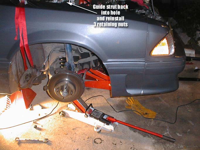 Reinstall the 3 nuts holding the strut top to the chassis. Once these nuts are torqued back down, you can lower the jack out of the way. Reinstall the claliper and you are done with one side!