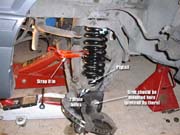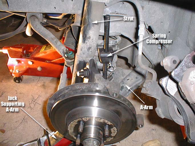 Place jack under a-arm (out towards the wheel end) and raise jack so it just supports the arm. Install spring compressor and compress spring about half an inch.