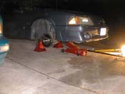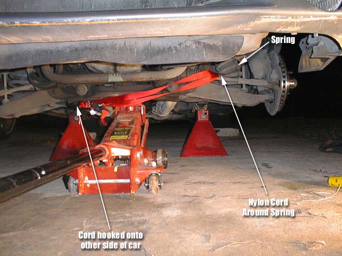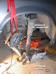 Now that strut is disconnected, SLOWLY lower jack until it is fully lowered. The spring should be almost totally decompressed. While its still strapped in, give it a shove with a long rod....I got under the opposite side of the car and poked from there. If spring doesnt easily pop out after a few shoves you can try putting another strap on the spring and tug outwards with it, or you can jack the a-arm back up and then compress the spring compressors another centimeter or two.
