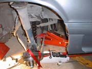 Now jack the end of the A-Arm back into place, while slowly guiding the strut back into its mounting hole. If needed, compress the strut by hand to manuever it back where it belongs.