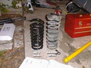 Now you get to wrestle with the new springs. There should be a rubber "shoe" that was on the top of the spring...mine actually suck to the ceiling and didnt come out with the spring. With the "shoe" stuck in there (rather than on the end of my uninstalled spring), it made it a lot easier to wedge the new spring in. What I did was put the top (flat part) of the spring in first and fit it in the shoe, then press down on the a-arm as much as possible and force the bottom of the spring to go over the round spring retainer bump. You want to make sure the pigtail on the spring covers *ONE* of the drain holes on the A-Arm spring seat.
