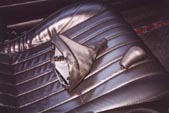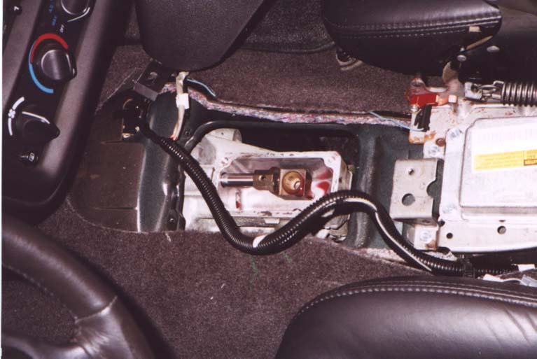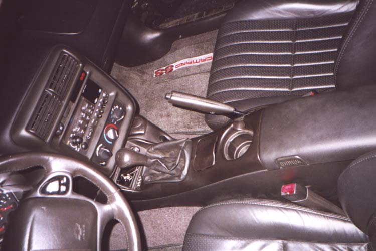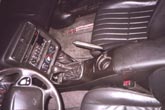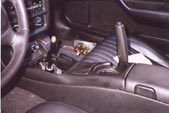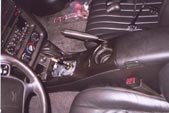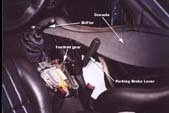 Below the ashtray you'll see one 10mm bolt head, remove this. Then open up your console storage bin and remove 3 more 10mm screws from there, as well as 2 7mm ones.Now look where the front of the console down by the foot area, and you'll see one more 10mm screws holding the console on each side. Remove both of these. Now, your console is completly unbolted, carefully lift up on it making sure that the parking brake lever isn't getting damaged by the sharp plastic edges of the console. Also be warned that the console is still tethered to the car by some electrical cables for the lighter...these cables can stay attached. Once you have the console lifted off of the parking brake lever and shifter stick, gently set it down on the passenger seat like shown in the picture to the left. |