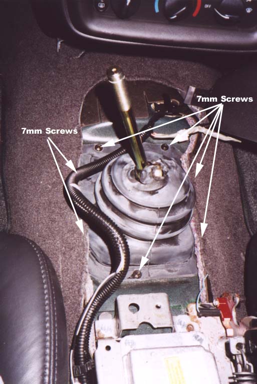 Next, remove the 7 7mm hex screws from the black rubber boot that is on the stock shifter. 4 of them on the sides will probably be covered by carpet...just move that out of the way. |