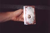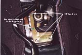 Now, look through the slit in the console where the parking brake is and you can see a small copper colored "paw" which is set against a curved geared piece of metal. This is the part that goes "click click click click" when you pull up the parking brake....pull the lever up a couple of times and see where the noise comes from to help find the part. So, with the lever all the way down, you see the copper colored "paw" isn't quite touching the gear, so slide your flathead screwdriver inbetween the paw and the gear, then lift up on the lever. It shouldn't be making any "click click click" noise since the screwdriver is inbetween the pieces and the lever should come all the way straight up, like shown in the picture to the left |