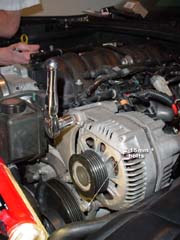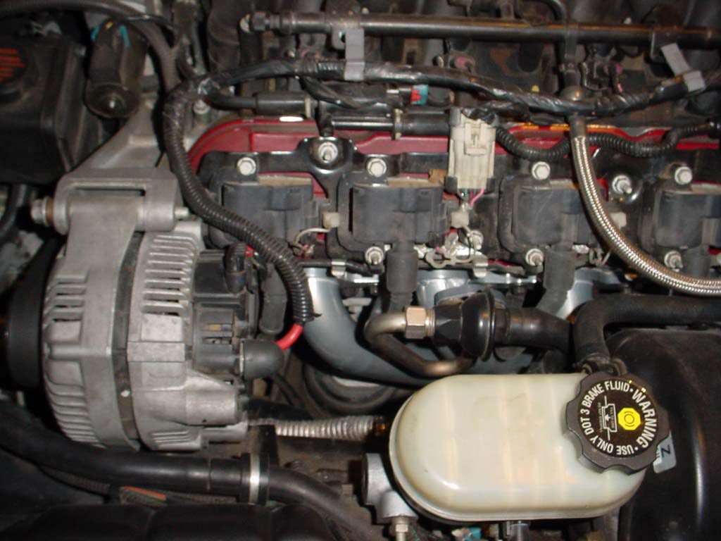 Next, remove the drivers side valve cover. On '99+ cars it is only held on by 4 8mm bolts. On LS1's (NOT LS6's) there will also be a PCV hose you'll need to use a flathead screwdriver to pry up and out of the grommet). If you have a 97-98, you'll have permiter style valve covers which have a few bolts around the outer edge of the valve cover. Remove the bolts and set the valve cover aside.