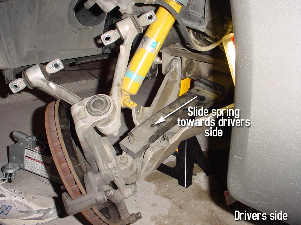 Now the spring is loose, we need to lower the drivers a-arm as much as possible, and slide the spring out about 6" to 12" over towards the drivers side. Remember when we removed the caliper and swaybar endlink on this side? That is so we can push this a-arm down as far as possible so we can slide the spring over. The diagram on the left shows what I'm talking about.