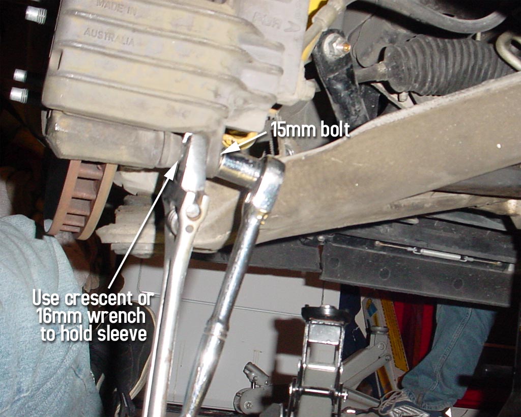 On the drivers side, we'll do it just like the passengers side. Jack it up, reinstall the shock bolts and reinstall the 4 a-arm bolts/shims. Now, re-mount the caliper onto the caliper frame and using the crescent wrench to hold the sleeve, torque these bolts (use loctite!) to 23 lb/ft. Re-attach the ABS wire sensor plug.