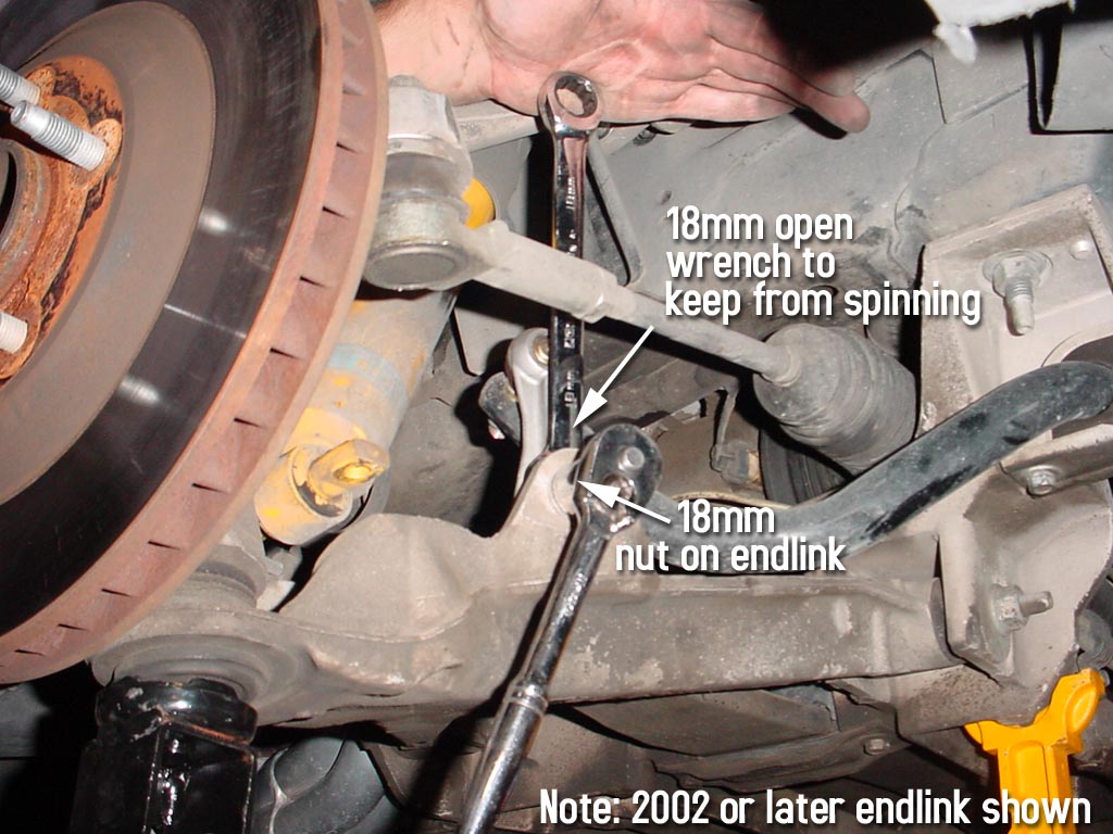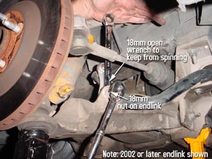 On 2002 cars, or cars with the new aluminum style endlinks, you'll need an 18mm open ended wrench and an 18mm socket wrench to remove it. They remove similar to the way the brake caliper bolts were, you use the open wrench to keep the shaft from spinning and the socket wrench to loosen the nut.