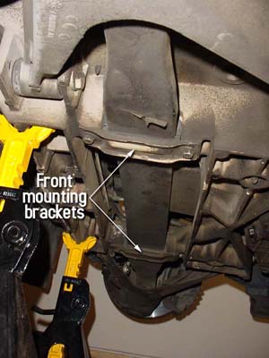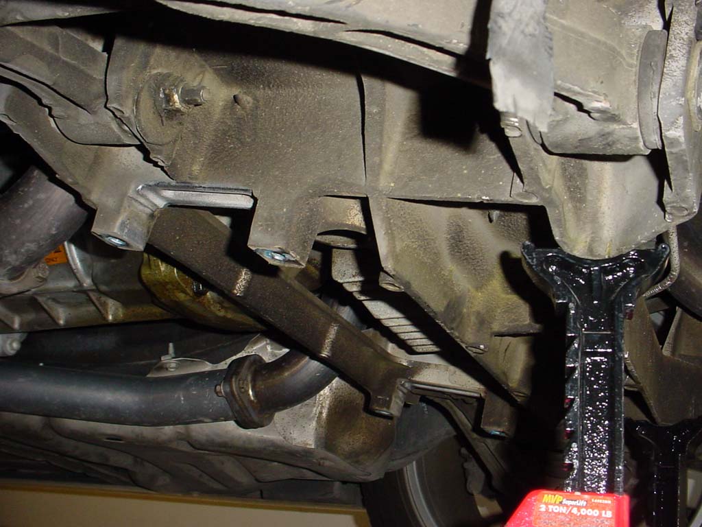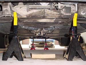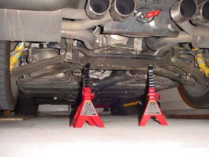 First we need to get the rear of the car in the air. Chock off the front wheels and jack up the rear of the car by jacking up the rear crossmember (the big aluminum support under the differential), and then place 2 jack stands under the cross member and lower the car onto it.