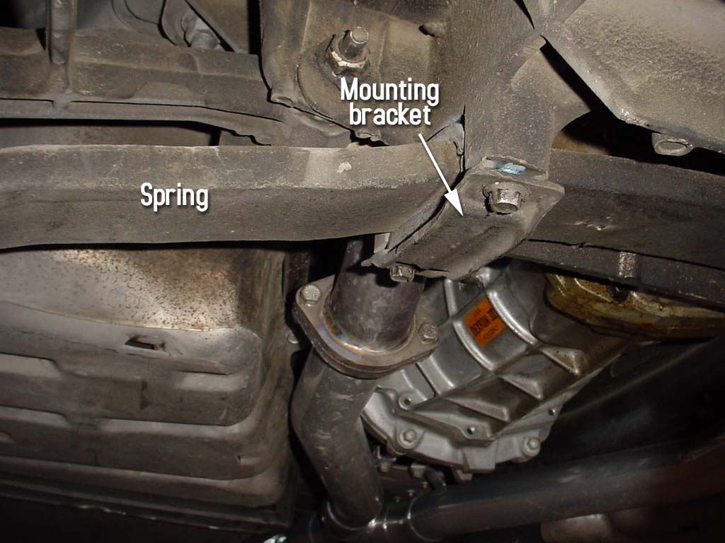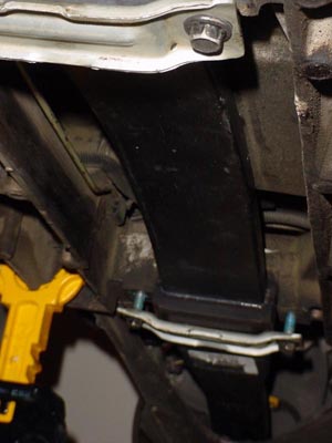 Now, tighten up the spring mounting bracket bolts a little at a time on each side and make sure spring is centered. The bushings will not be exactly dead center on in each spring mounting bracket, but you still need to ensure that the spring itself is centered on the car. Keep tightening these bolts until the bracket is totally bolted up, and then torque the bolts to 46 lb/ft.
