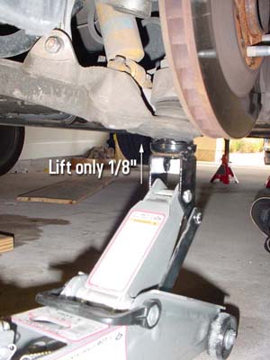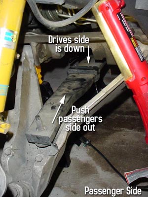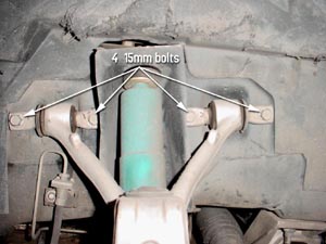 Now, go to the passenger side and place the jack under that side and raise it up 1/8" like you did the other side. On the passengers side, unbolt the 4 upper a-arm bolts (REMEMBER, keep the shims in order!) and 2 bottom shock bolts. Now lower the jack. NOTE: You should be able to leave the caliper mounted and the swaybar attached on the passengers side. Once the jack is lowered, make sure the brake line going to the caliper isn't getting stretched too much. As long as your wheels were pointed straight ahead you should be fine.