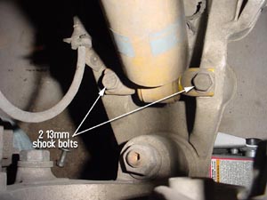 Next, at the bottom of the shock absorber, there are 2 13mm bolts with 2 13mm nuts on the bottom ends of them. Unbolt both of these and remove the bolts. Your lower A-arm is now totally free to hang down, so lets let it do that. SLOWLY lower the jack and the a-arm will drop down somewhat until all spring pressure is relieved. We're done on the drivers side!