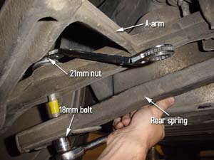 The spring should now be relieved of tension. If there is still tension, it's probably because your spring height adjusters are adjusted out some. If this is the case, mark where the threads on the adjusting bolts are with tape and turn the adjusters with a 10mm wrench on the top of the bolt so the threads are sticking up as much as possible (thus relieving tension).