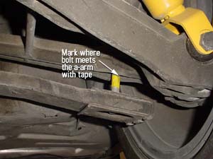 What I do next is optional, however it really helped me to get the car sitting at an even height after the spring swap. I took some tape (in my case, yellow tape) and wrapped it around the bolt so that the top of the tape was even with the metal of the lower A-arm. It's just a visual way to see how far in the bolts should be so we can at least get it close when we re-assemble things later.