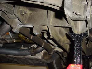 First, we need to get the front of the car up in the air. The method I use is to drive the car up on rhino ramps first, and then break the lugnuts free on both of the front wheels using a 19mm deep socket on a breaker bar (a tire iron will work just as well). Then I use a jack to jack up the front crossmember and then place 2 jack stands to support the crossmember. This is shown in the picture to the left.