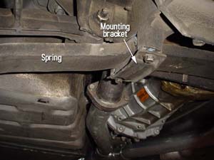 Now that the spring is totally relieved of pressure, we can unbolt the 2 metal spring mounting brackets that hold the spring to the crossmember. Using a 13mm wrench, unbolt the 4 bolts (2 on each mounting bracket).